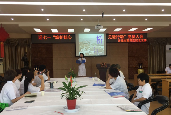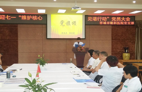 为纪念中国共产党成立96周年,深入推进“两学一做”学习教育常态化、制度化建设,充分发挥党组织战斗堡垒作用和共产党员先锋模范作用。2017年6月28日下午,晋城市眼科医院党支部组织全体党员召开迎七一“维护核心 见诸行动”党员大会。共开展三个方面内容:支部书记上党课、重温入党誓词、诗歌诵读和唱红歌。