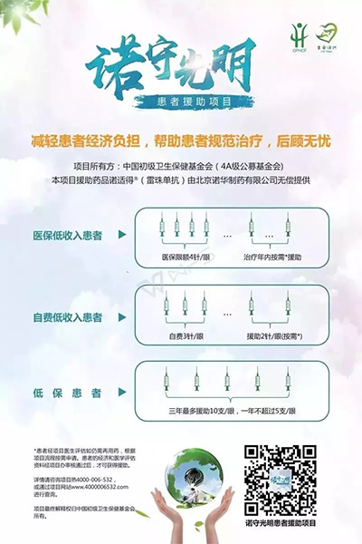 为帮助更多因经济困难无法继续接受治疗的眼底病患者,晋城市眼科医院经过申请,成为中国初级卫生保健基金会开展的“诺守光明-患者援助项目”晋城地区唯一定点医院,协助低保和自费患者申请项目援助,帮助更多的眼病患者受益,让光明延续。