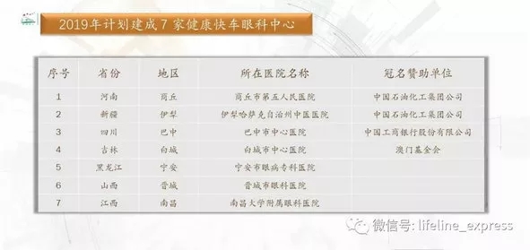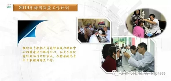 在健康快车2019光明行工作计划中,我院为拟定成立全国7家健康快车眼科中心之一,同时将继续协助开展晋城地区糖尿病视网膜病变筛查防治项目活动,促进糖尿病视网膜病变早发现、早治疗,降低糖尿病患者失明率,提高患者生活质量。