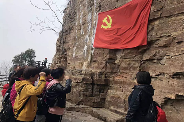 红旗渠青年洞现场,全体党员举起右拳,在党旗下进行庄严宣誓,再次唤起每一名共产党员立志要为共产主义伟大事业奋斗终身的神圣使命感。