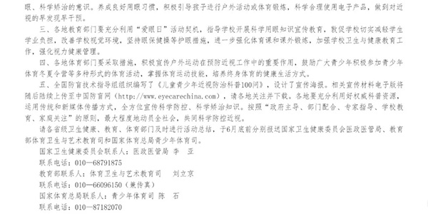 一、儿童青少年近视问题关系到国家和民族的未来,防控儿童青少年近视需要全社会共同努力。各级卫生健康、教育、体育部门要进一步认识儿童青少年近视防控工作的重要性,加强沟通协作,共同推进儿童青少年视力保护工作。