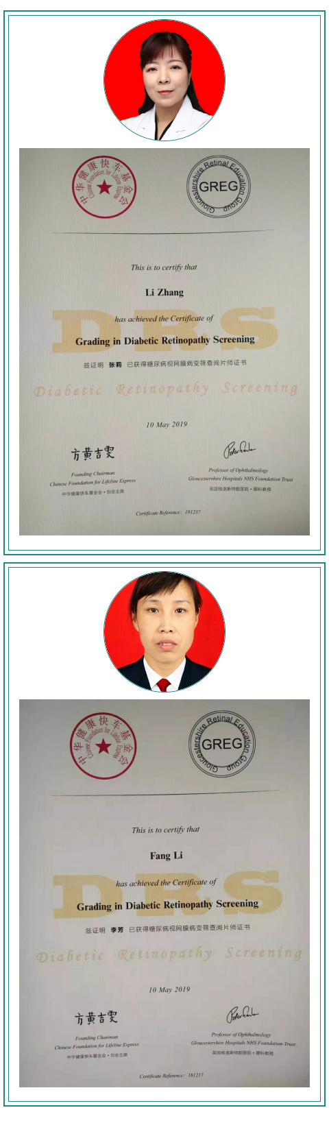 截至2018年底,健康快车在全国21个省份5家中央阅片鉴定中心,培训234名学员通过阅片师资格考试,其中我院张莉、李芳大夫位列其中,经过课程学习及考试后,获得了由健康快车、英国格洛斯特郡医院双重认证的"糖尿病视网膜病变筛查阅片师"证书。这标志着我院在糖网病及眼底病的诊疗技术方面的不断提高。
