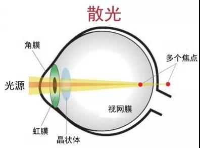 散光:因为角膜的弧度不均,导致光线不能准确聚焦在视网膜上,一点散成多点。