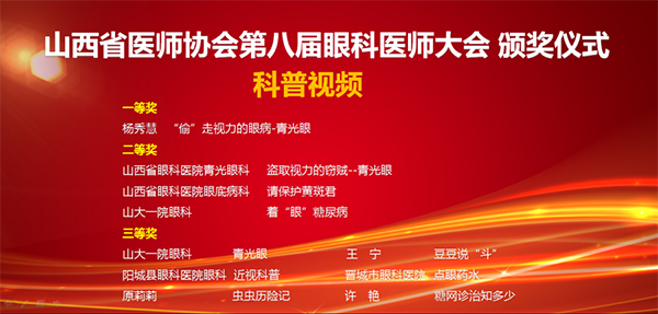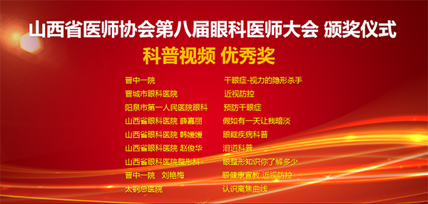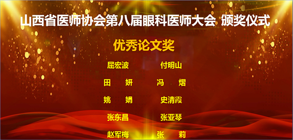 本次大会主题“守正创新 光明三晋”,会议设白内障、青光眼等多个专题,内容非常丰富实用,线上线下结合授课形式灵活。会议还设立了首届眼健康科谱视频评选活动,我院护办室的《点眼药水》荣获三等奖,视光学科的《近视防控》荣获优秀奖;在优秀论文评选活动中,我院张莉主任的《超声乳化术中灌注液迷流综合征的治疗方法》、田妍副主任的《白内障超声乳化后角膜后弹力层脱离1例》分别荣获优秀论文奖;更值得称赞的是我院聂军红主任荣获山西省首届优秀眼科医师奖殊荣。