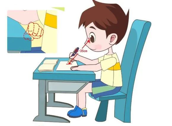 注意写字的姿势,眼与书本的距离要保持33厘米,身体和课桌之间保持1个拳头的距离,提笔时手和笔尖要保持3.3厘米的距离。不要在阳光直射下或暗处看书;不要躺着、趴着或走动、乘车时看书。